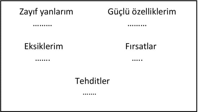 Kendimizi tanımanın ilk adımı swot analizidir. Bunu belirli aralıklarla yapmamız durumunda istek ve davranışlarımızın yanlış istikametlere doğru ilerlemesini de engellemiş oluruz. Aşağıda ki swot analize bakarak kendinizi değerlendirebilirsiniz. Bu analizin sağladığı farkındalıklar sonucu, hatalarımızı azaltmış, fırsatları ve tehditleri görmüş olacağız.