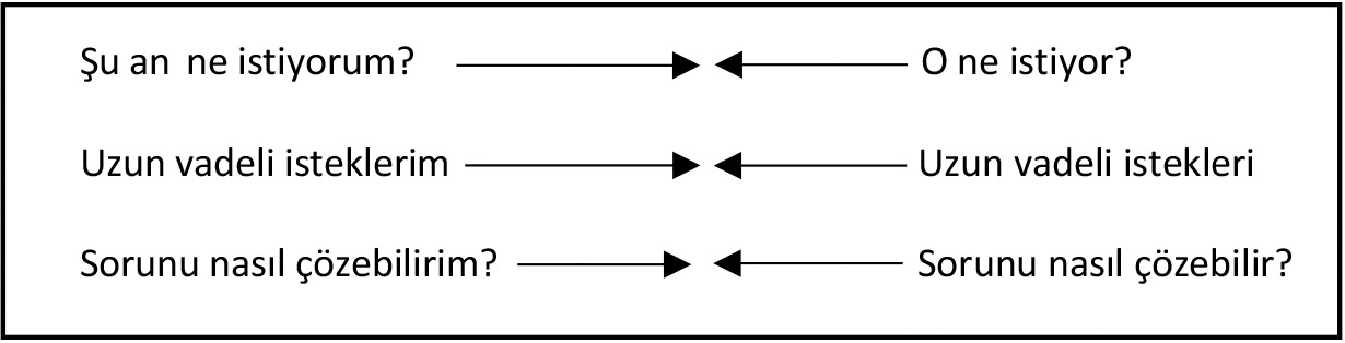 Aksi halde iletişimimiz, sadece olumsuz iç söyleşiler şeklinde zihnimizde dönüp duracaktır. Ayrıca var olan çatışmaları ortadan kaldırmak için de bu şemayı kullanabilirsiniz. Aşağıdaki şemada gösterilen soruların altına isteklerinizi ve onun isteklerini yazarak karşılaştırabilirsiniz.
